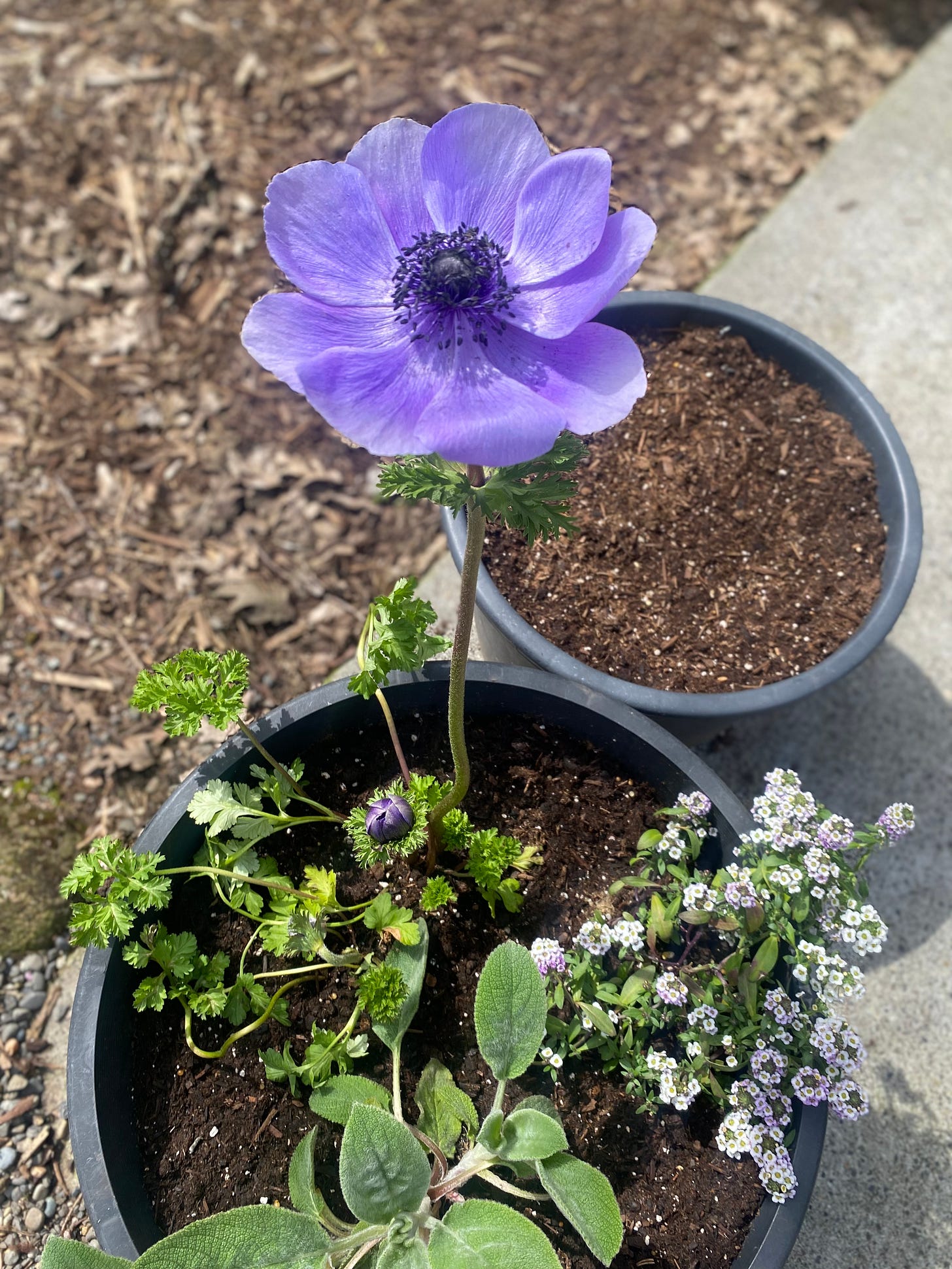 My favorite day this week was choosing a few flowers for our back patio (everything pictured here). At the nursery, one flower stood out above the rest— this Marianne Blue Anemone. When I got home, I looked up the common associations to the flower, and I read that it’s a symbol of ‘anticipation.’ Because they close up at night or during cloudy weather, they symbolize the feeling of waiting, like something is about to happen.